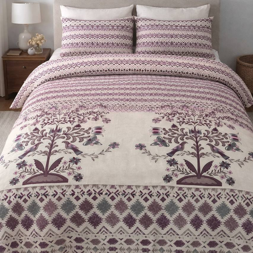 Queen-size duvet cover made from soft, breathable 100% cotton, featuring an elegant boho pattern with floral, geometric, and ornamental details in warm rose, plum, sage, and cream tones. Designed with a convenient bottom zipper closure for easy everyday use. Perfect for creating a cozy, stylish bedroom atmosphere. Discover premium cotton bedding by Sasha Atelier.